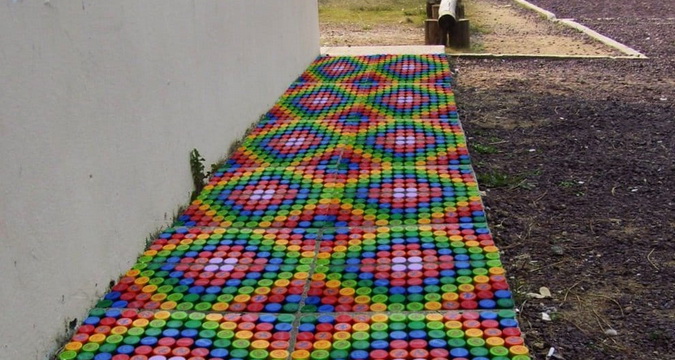 Пластиковые крышки — идеальны для отделки дорожек на дачном участке. Материал разлагается на протяжении 100 лет, длительное время не теряет своих внешних качеств, а его цветовая гамма очень разнообразна. Если все же под воздействием солнечных лучей пробки поблекнут, то можно покрыть их краской нужного цвета.
