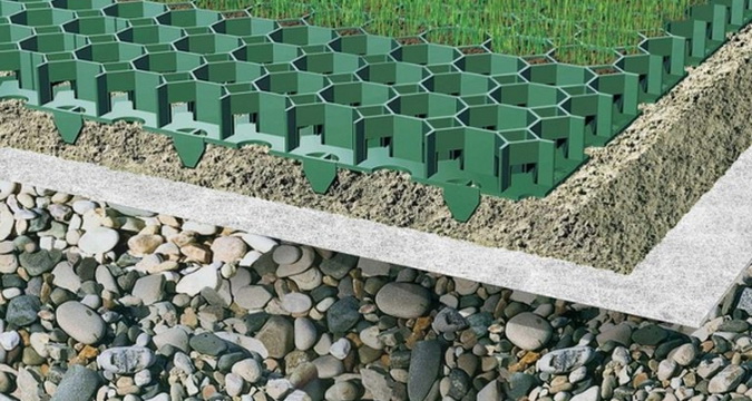 Газонные решетки обычно изготавливают из зеленого или черного пластика, их ячейки имеют сотообразную или ромбовидную формы. Решетки имеют хорошие дренажные свойства, отличаются повышенной прочностью, легко монтируются и доступны по цене.