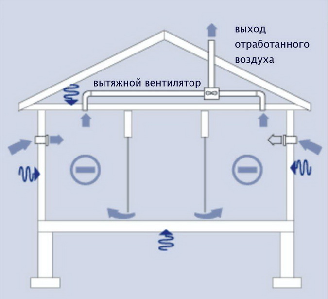 Этот тип вентиляционной системы одинаково работает дома и в гараже. Приток возможен из-за различий в плотности и давлении воздуха внутри и снаружи гпомещения. Воздух с более высокой температурой из гаража имеет меньшую плотность, чем более холодный воздух снаружи. Вот почему он течет вверх. Весь процесс конвекции возможен благодаря форточкам.