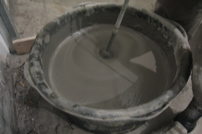 Разводить раствор следует в непосредственной близости от заливаемого участка. Если позволяют условия, то раствор можно готовить прямо на полу, если нет, то подойдет любая ёмкость для этих целей. Главное, чтобы раствор был хорошо перемешан.