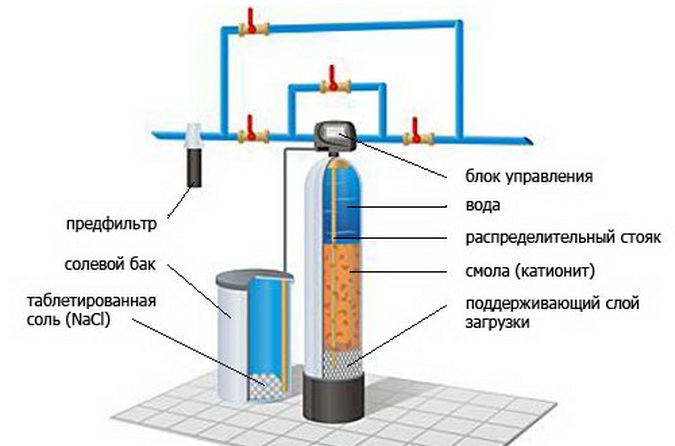 Умягчитель воды состоит из нескольких элементов: