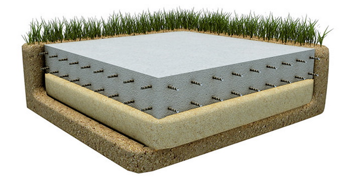 - Армированная плита включает в себя те же элементы, но также имеет арматуру, залитую бетоном. Бетон для армированной плиты должен быть дозирован в количестве 350 кг/м3.