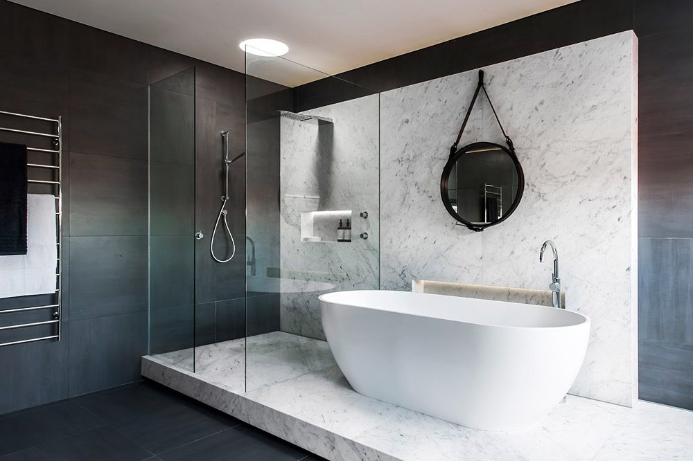 Черные стеновые панели. Черно-белая или полностью черная ванная комната, несомненно, всегда в моде. Предлагая умный баланс между естественной и утонченной атмосферой, черные стеновые панели особенно хорошо сочетаются с деревянной мебелью.