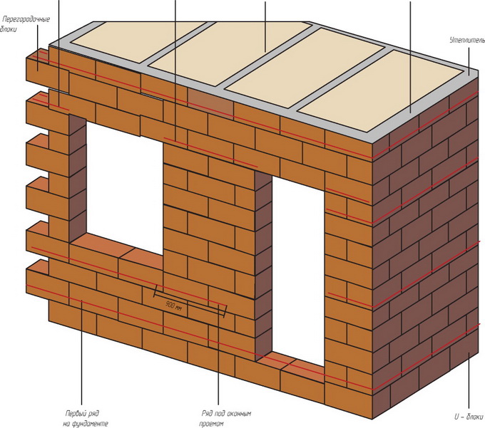 При использовании таких блоков можно изготавливать перемычки над проемами по ходу кладки. Для этого в проем под монтируемую перемычку устанавливается временная подпорка. Дальнейшие операции проводятся в описанном выше порядке.