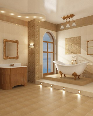 Если ванная комната просторная, эффективным считается многопозиционное освещение при помощи мелких светильников, чаще всего галогенных. В последнее время популярность приобретают подвесные потолки со встраиваемыми светильниками, при этом материал потолка может быть практически любым.