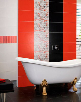 Уменьшить пространство большой комнаты можно, используя на разных стенах плитку разных цветов. Насыщенные оттенки лимонного, алого, бежевого, цвета красного дерева, розового или медного идеально подходят для того, чтобы создать из ванной своеобразную тихую гавань для отдыха.