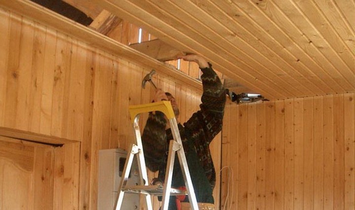 Монтаж вагонки своими руками производится на специальном каркасе (обрешетке) из брусков с примерным сечением 25 × 40 мм. Такой способ крепления позволяет облицевать потолок, имеющий даже необработанные поверхности и некоторые неровности. Расположение вагонки может быть прямое, диагональное и «елочкой». При диагональном и вертикальном креплении вагонки бруски каркаса располагают горизонтально; при горизонтальном и креплении «елочкой» — вертикально. Каркас формируется перед тем, как крепить вагонку к потолку.