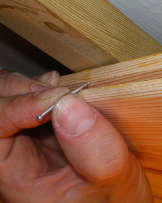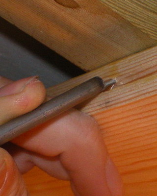 Более сложным, но зато аккуратным способом крепления вагонки является забивание гвоздя в нижнюю грань паза, при этом его шляпка «утапливается» в древесину.