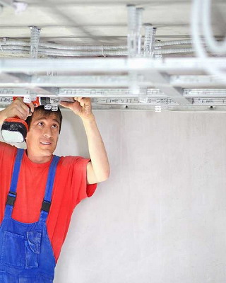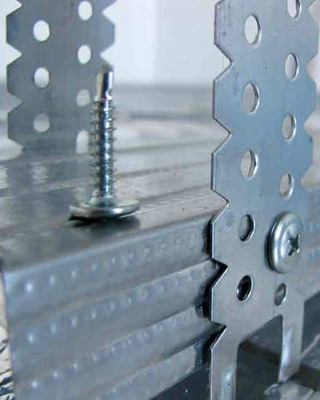 На смонтированный каркас с помощью телескопического подъемника (или в случае его отсутствия — подпорок) последовательно устанавливают гипсокартонные листы. Крепежные работы нужно вести от угла листа в двух взаимно перпендикулярных направлениях. Шаг размещения шурупов саморезов вдоль несущего профиля каркаса не должен превышать 150 мм.