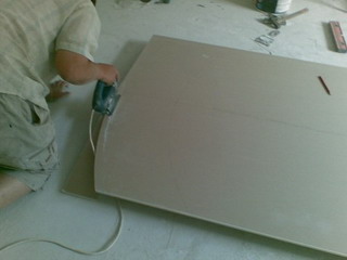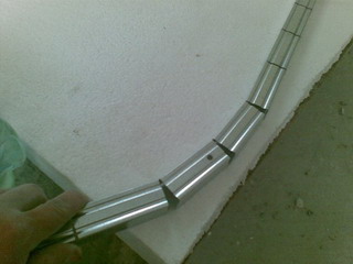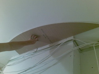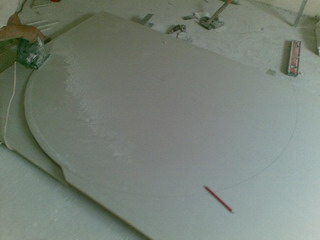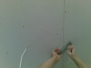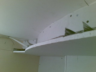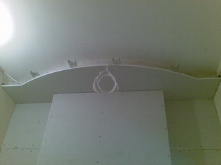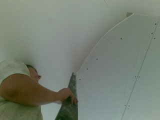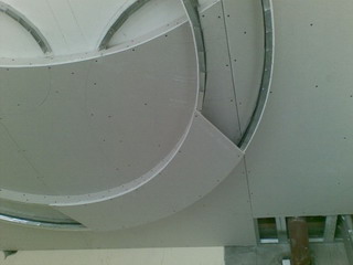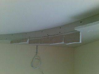 Торец получившегося каркаса криволинейного элемента облицовывают полосками гипсокартона, прошедшими предварительную подготовку (перфорацию и увлажнение).