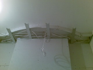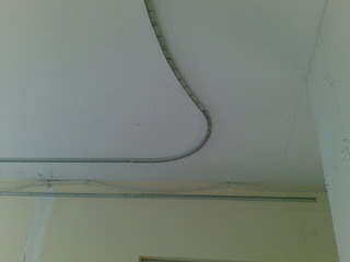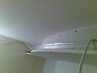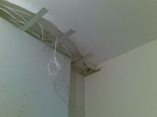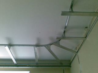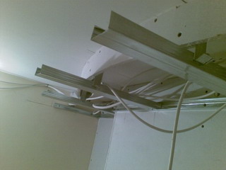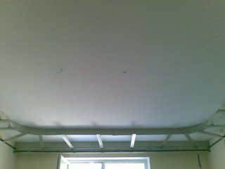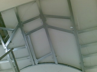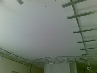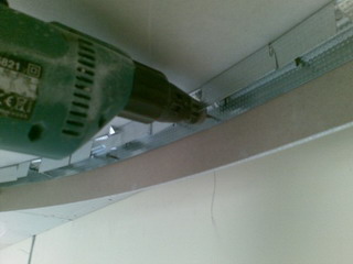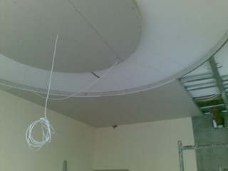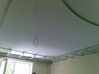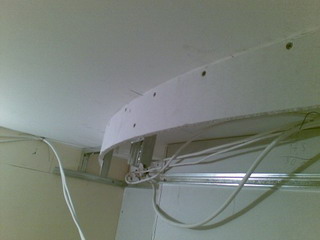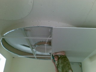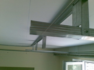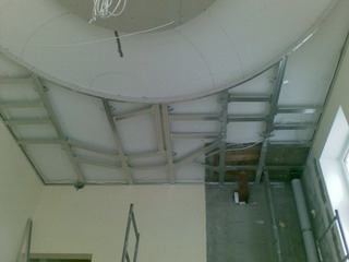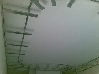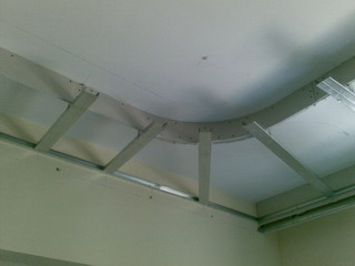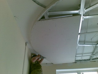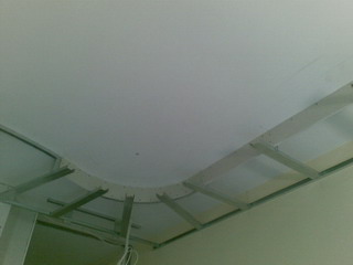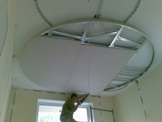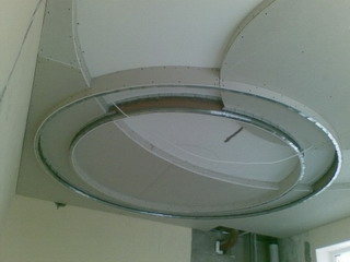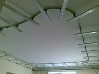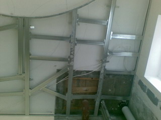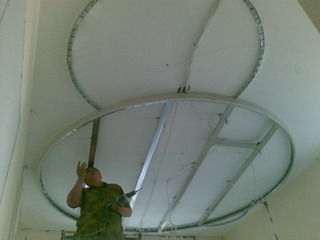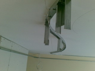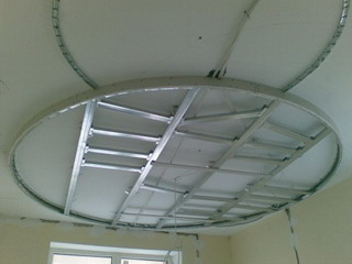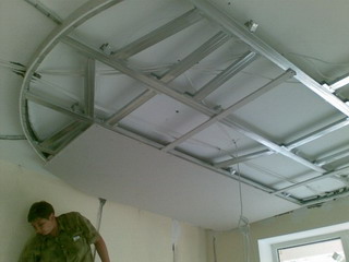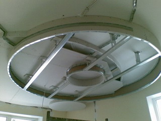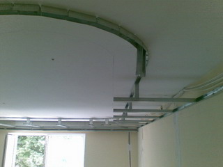 Затем монтируют каркас многоуровневого потолка из гипсокартона из ПИП и ПП по правилам, описанным для прямолинейного короба. Шаг установки стоек-подвесов во многом будет зависеть от степени кривизны элемента, но не должен превышать 200 мм. Плюс обязательно по одному отрезку на каждый стык гипсокартонных полос.