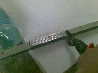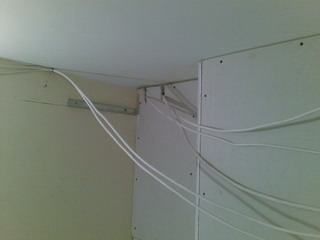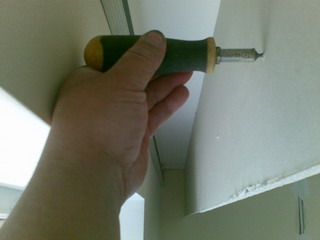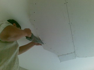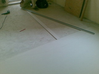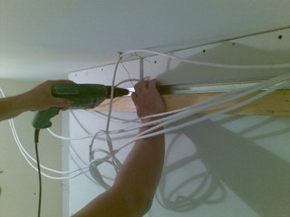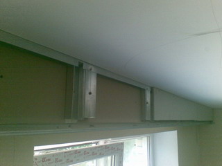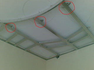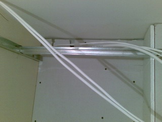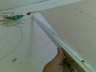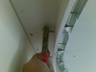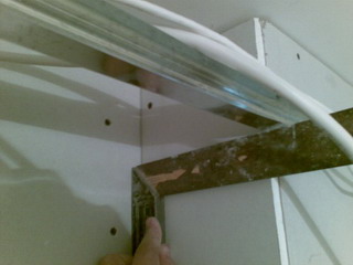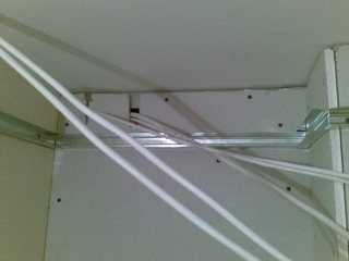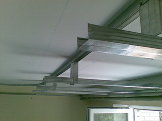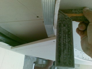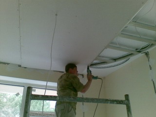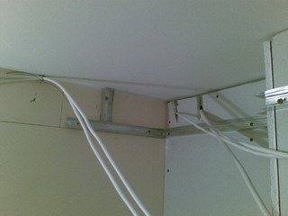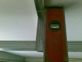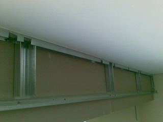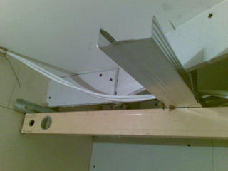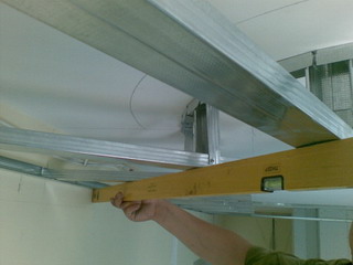 После этого вставляют ПНП-профилъ с прикрученными к нему отрезками в ПНП-профили, закрепленные на стенах. Выравнивают его и прикручивают шурупами-саморезами по металлу к вертикальным ПП-профилям.