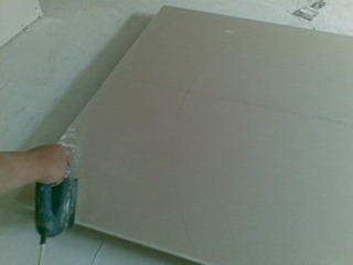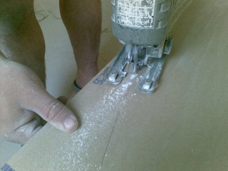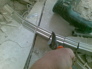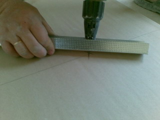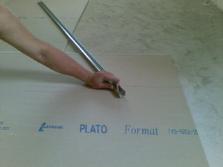 Затем подготавливают из потолочного натравляющего профиля два одинаковых комплекта изогнутого профиля. Для этого острыми ножницами по металлу делают в нем разрезы через каждые 50—150 мм (в зависимости от радиуса изгиба). При этом следует придерживаться следующего правила; если торцевая часть криволинейного элемента вогнутая — делается прямой разрез, а если она выпуклая, нужно делать не разрезы, а треугольные вырезы.