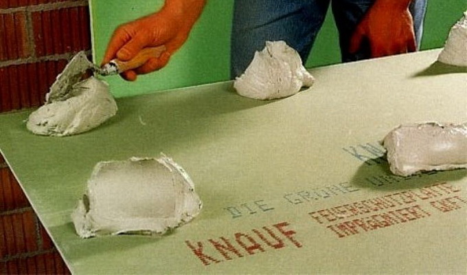 В том случае, если стена имеет неровности, но их величина не превышает 20 мм, клей на гипсокартонный лист наносят небольшими лепешками по всему периметру с шагом 200—250 мм и в середине листа — в шахматном порядке с расстоянием между кучками 300—350 мм. Для того чтобы лист надежно держался на стене, общая площадь лепешек клея должна составлять не менее 10 % от его площади Слой клея (высота лепешки) зависит от степени кривизны стены и может достигать 30 мм (с учетом тою, что при установке листа вы его немного прижмете).