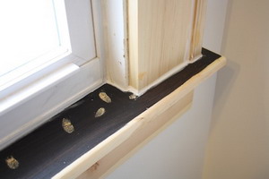 Ранее уже было сказано, что всё пространство под подоконником заполняется монтажной пеной. Предварительно смочите наносимые поверхности из распылителя водой. Влажная поверхность обеспечивает более крепкое налипание монтажной пеной. Но при расширении пена может поднять подоконник. Как закрепить подоконник, чтобы пена не могла его поднять? Во-первых, пену надо наносить разумными порциями на расстоянии друг от друга, а во-вторых, подоконник нужно поставить под гнет, чтобы пена не могла с ним справиться, а выходила бы из щелей. При желании можно сделать приспособление для фиксации подоконника из подручных средств. Для этого подойдёт деревянный брус. Нужно расположить его на всю ширину подоконника и установить две распорки, упирающиеся вверх оконного проёма. Этот способ фиксации пластикового подоконника является более надёжным, просто поверх уложенный груз.