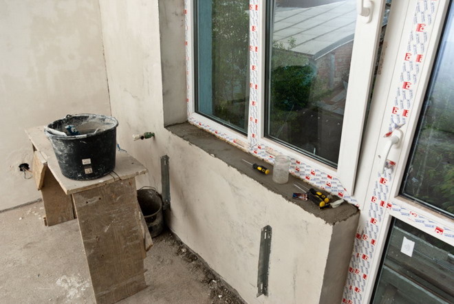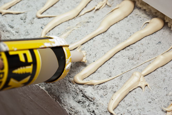 Приготовления закончены – далее нужно пространство под подоконником заполнить монтажной пеной. Пену не экономьте. Необходимо надёжно закрыть все пространство под подоконником. При плохой обработке пеной жёсткость подоконника ослабится, что приведёт к его дисфункции. В таком положении конструкция оставляется на сутки не меньше. Объём пены большой и застывать она будет, соответственно, дольше. После того, как пена высохнет, её излишки нужно срезать ножом. Теперь очередь для штукатурными и малярными работами.