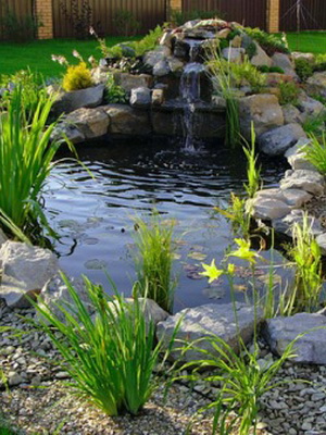 Сделав отвод из системы центрального водоснабжения с использованием крана и поливочного шланга, неглубоко закопанного в грунт, отрегулируйте открытие крана так, чтобы вода капала в бассейн. Частота падения капель должна быть отрегулирована таким образом, чтобы уровень воды в водоеме был одинаков. В случае обильных дождей кран на некоторое время закройте. Конечно, водоем нужно обсадить влаголюбивыми растениями и цветами, желательно в несколько ярусов, можно сделать горку из естественных красивых камней.