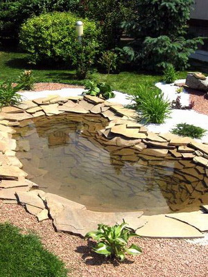 Сделать водоем на участке совсем несложно. Нужно вырыть котлован с покатыми стенами, на дно уложить хорошо мятую глину (слоем 15-20 см). Загладив глину водой, дайте дну водоема просохнуть и положите такой же второй слой глиняной подушки. Затем сверху насыпьте гальку (можно мелкую щебенку) и утрамбуйте.