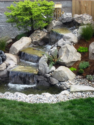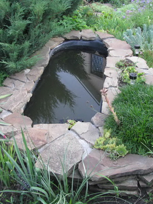 При наличии желания и свободного времени, можно сделать «журчащий» водоем с циркуляцией воды в замкнутом объеме. Для этого вам понадобится маломощный насос с электропитанием на 9-12 В, так как прокладывать электропитание 220 В даже к маломощному насосу достаточно опасно. Такие насосы есть в продаже в автомагазинах, зоомагазинах (для аквариумов). Насос забирает воду со дна водоема и направляет ее по закрытому грунтом шлангу наверх, откуда вода стекает по ступенькам из природных камней, закрепленных на растворе. Желательно поверх полиэтиленовой пленки, уложенной в несколько слоев на дне котлована, положить арматуру из мелкой сетки, залить все слоем бетона (толщиной 10-15 см), всю внутреннюю поверхность покрыть цементно-песчаным раствором (1:2) толщиной несколько см, а напоследок на влажный раствор насыпать тонким слоем чистый цемент и затереть поверхность. Чтобы во время дождей вода не переливалась через края водоема, сделайте в одном месте перелив через трубку в яму — колодец, расположенный рядом с водоемом. Яму заполняют щебенкой, сверху засыпают грунтом, на который укладывают камни и высаживают растения.