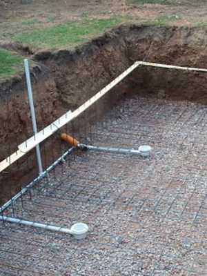 Далее на дно котлована насыпают гравий (10-15 см), песок; весь слой трамбуют, используя воду, расстилают в несколько рядов полиэтиленовую пленку, кладут арматуру, снова все заливают бетоном с небольшим уклоном в сторону водосливной трубы с вентилем.
