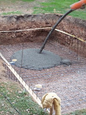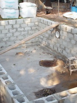 Вставив переливную и сливную трубы в стенки (диаметр труб около 10 см), снова все заливают бетоном. После схватывания бетона опалубку снимают и роют котлован глубиной 1-2 м.