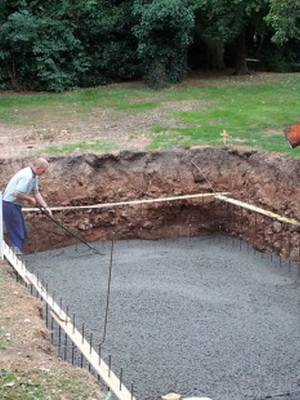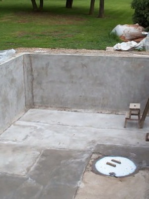 Сооружать бассейн начинают со стенок. На глубину 50-60 см выкапывают по периметру бассейна траншеи, заливают их бетоном, укладывают на внешние стенки гидроизоляцию (рубероид, пергамин), устанавливают арматуру — крупноячеистую сетку. После этого устанавливают опалубку.