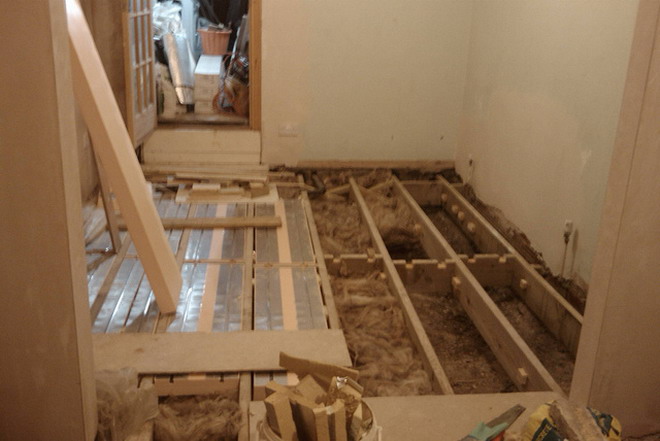 Если требуется частичная или полная замена деревянных лаг, эту работу необходимо сделать. После этого можно приступать к укладке утеплителя в пространства между лагами.