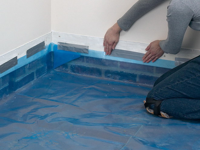 - Укладка на плиты перекрытия гидроизоляции (как правило, это пленка, которая укладывается на хорошо очищенную стяжку);
