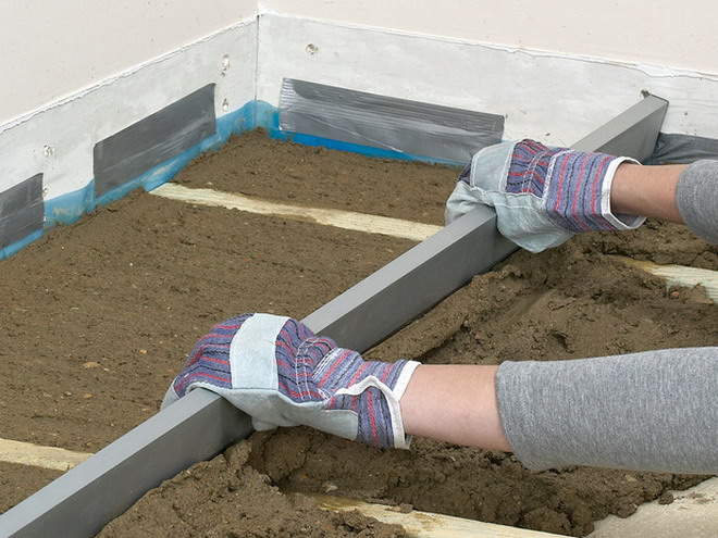 После этого определяется уровень, который отмечается маячками, которые устанавливаются и крепятся на полу ванной.