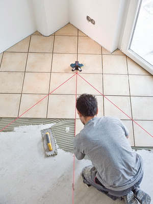 Есть два способа настила пола плиткой: симметричный (первая плитка в центре пола, остальные крайние перерубаются) и несимметричный (плитка укладывается с угла вдоль стен, тогда перерубаются и притачиваются плитки только у двух стен). Наконец, и часто это проще, если небольшая часть плитки не входит на пол, подрубить нижнюю часть стен, что, особенно если стены деревянные, не составляет большого труда.