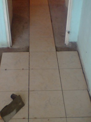 Начинается укладка пола: между марками положите цементный раствор (или специальную мастику для укладки плиток на пол). Толщина выровненного слоя цемента должна примерно на 4-5 мм превышать толщину раствора под маяками. Поставьте первую плитку рядом с маячной и кладите весь ряд, осаживая плитки несильными ударами ручки кельмы. Плоскость проверяйте ровной рейкой (правилом), а еще лучше — уровнем. Так ряд за рядом настилайте пол, убирая лишний цемент, либо подкладывая его небольшое количество под отдельные плитки. Настилайте все плитки до маяков, затем снимите маяки, тщательно срубите гипс, уложите маяки на цементный раствор. Выдавленный из швов цемент надо удалять, уложенные плитки протирать, через трое суток — залить пол жидким цементным молоком для заполнения швов, еще через сутки протереть пол влажной тряпкой, оставив цемент в швах. Можно обработать поверхность 3%-ным раствором соляной кислоты, затем быстро промыть пол мыльной водой (или раствором соды), а после — чистой водой. Окончательно покрытие окрепнет