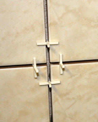 Укладка плиток на стене начинается с провешивания стен отвесом и крепления марок: на небольшой стене — в верхних и нижних углах, при больших размерах стен дополнительные марки располагаются между угловыми. Затем ставят рейки-отвесы по краям стены, к которым крепят горизонтальные направляющие шнуры, и начинают облицовку плитками снизу. Ширина швов регулируется шаблонами — клиньями с толщиной, равной толщине шва.