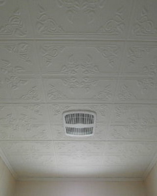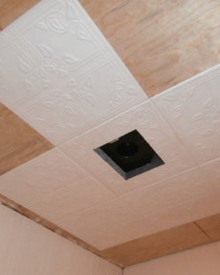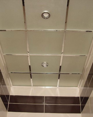Используя морилку, можно придать решетке любой цвет, подходящий по тону к уложенной плитке. Далее, с помощью резца, матовое оргстекло нужного вам цвета режется на квадраты, прямоугольники и т. п. под решетку, которые укладываются сверху нее встык между собой, чтобы не было щелей и наложения кусков оргстекла друг на друга. При таком варианте отделки потолка в доме в пространстве между основным потолком и решеткой на металлической проволоке в выбранном вами порядке вешаются электрические патроны с электролампами — их все равно не будет видно. Свет, проходя через матовое оргстекло, будет равномерным. Над зеркалом в ванной обычно крепится бра. Подводку под него закладывают до отделки стен. Как видно на фото, для отделки потолка вместо оргстекла можно взять простое цветное стекло с фактурой, типа тех, которые используются в некоторых видах дверей.