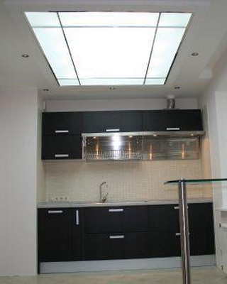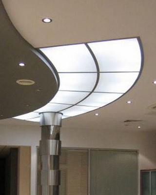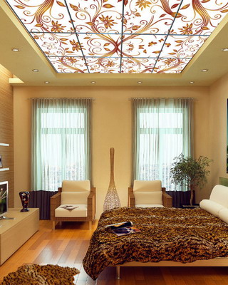 Удобен и красив подвесной потолок из оргстекла. Вначале ниже потолка закрепляется решетка, сделанная из отшлифованных и покрытых лаком деревянных реек.