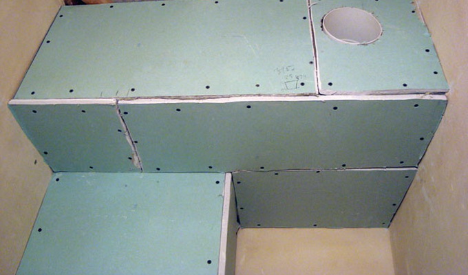 Следует обратить внимание на то, что при обшивке каркаса помещений, в которых будут располагаться санузел, ванная, кухня, обязательно нужно использовать влагостойкий гипсокартон — ГКЛВ. Обычно лицевая сторона таких листов оклеена картоном зеленого цвета.