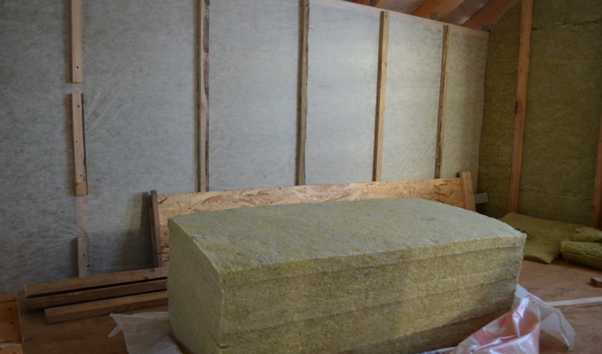 Лучше всего каркас дома заполнять базальтовыми плитами в два слоя: сначала — небольшой плотности, а поверх — уже большей.