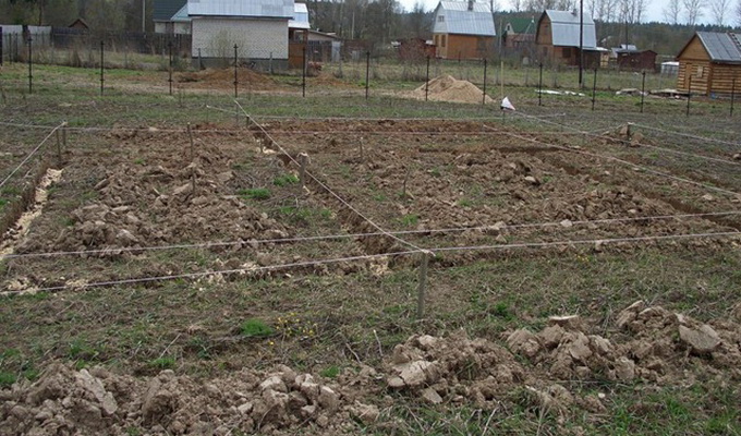 Для устройства фундамента для каркасного дома по периметру котлована устанавливают ограждения. Проверяют его прямоугольность натянутыми параллельными веревками. Затем утрамбовывают дно. Если земля влажная, то лучше всего уплотнять ее с помощью вибротрамбовочной машины.