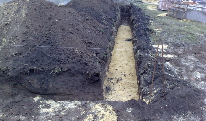 Для распределения давления от фундамента на грунт рекомендуется устраивать песчаную подушку. Сначала на дно котлована насыпается песок.