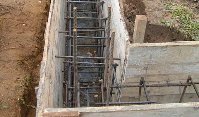 Сверху опять заливают раствор бетона. Расстояние от арматуры до верха фундамента должно быть не менее 5 см. Для того чтобы не было пустот и отверстий в теле бетона, уложенную смесь уплотняют с помощью вибромашин.