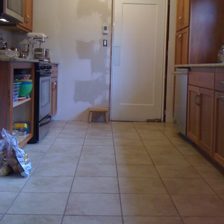 В качестве маяков можно также использовать песочно-цементный раствор с утопленными поверх кусками метлахской плитки или кафеля. После того, как будут установлены по маякам скользящие рамы, приступаем к заливу стяжки, выравнивая раствор по маякам правилом. Уже на следующий день после залива профили с раствора следует достать, замазать проемы и вычистить поверхность от ненужных остатков. По краям комнаты срежьте теплоизоляционную ленту острым ножом или монтажным резаком со сменными лезвиями.