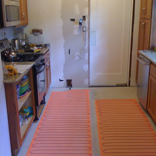 В случае с нагревательными матами, их следует расстилать по поверхности, набивая на основании пола. Также, следует руководствоваться рекомендациями от производителя. Укладывайте маты встык. Места соединений тщательно изолируйте, во избежание попадания на соединение раствора. Помимо этого, места соединений нагревательного и холодного кабеля, поверх которых надета муфта, должны быть расположены таким образом, чтобы впоследствии они были бы полностью покрыты раствором. После укладки нагревательных элементов следует уложить трубку для датчика температуры, в любом удобном месте между линиями нагревательных кабелей. Для эффективных показаний датчика, трубку следует закрепить, а конец тщательно закрыть во избежание попадания внутрь раствора.