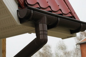 Во время настила кровельного материала необходимо установить водосточную систему. Если крыша имеет уклон более 15 %, имеет смысл установить организованную водосточную систему. В ее состав входят водосточные желоба с уклоном не менее 2 % и наружные водосточные трубы.