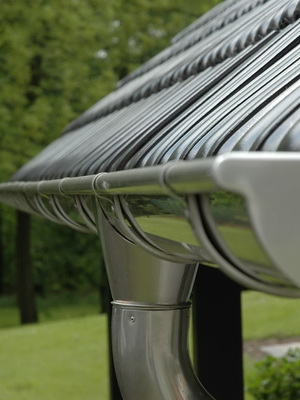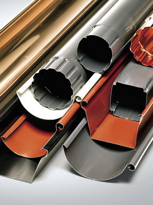 Алюминиевые водостоки нередко устанавливаются на крышах сложной конфигурации, так как алюминий хорошо гнется. В остальных случаях, как правило, водосточная система сделана из тех же материалов, что и кровля.