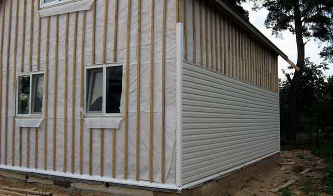 Вторым шагом готовят стены каркасного дома для монтажа сайдинга. Устанавливают вертикальную обрешетку по всей площади наружной обшивки стен. Для этого нужны деревянные рейки сечением 20×40 или 25×50мм.