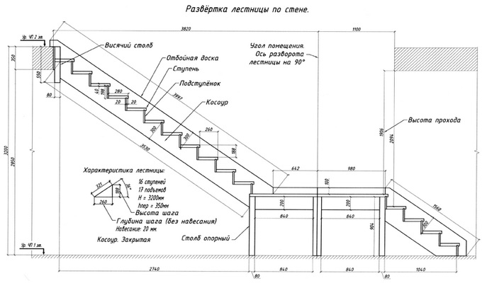 Предварительное проектирование и расчет лестницы производится графически по точному масштабу или в натуральную величину на стене дома. Например, нужно построить внутреннюю деревянную лестницу в двухэтажном доме. Планируемая ширина лестничной клетки — 3000 мм, длина — 6000 мм. Высота от пола первого этажа до пола второго составляет 3100 мм, расстояние между маршами — 100 мм.