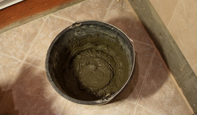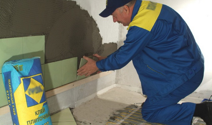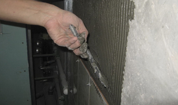 Прежде чем приступить к креплению плитки, готовят раствор. Лучше всего подойдет специальный плиточный клей. Его наносят шпателем на стену.