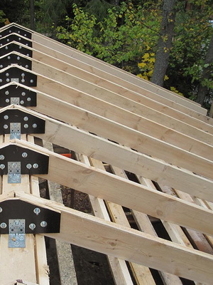 Для стропил вполне подойдет брус сечением 50×100 мм. Устанавливают стропила с шагом, соответствующим шагу боковых вертикальных стоек.