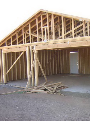 После возведения стен гаража по каркасной технологии приступают к перекрытию. Так как детали перекрытия гаража небольших размеров (по сравнению с деталями перекрытия дома), их удобнее собирать на земле и потом поднимать на место установки.