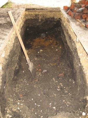 Как следует из видео, устройство в гараже смотровой ямы производится до заливки пола. Сначала роют углубление со сторонами 1,2×3,2 м и глубиной 2 м, затем его дно и стенки обкладывают двумя слоями рубероида, линолеума, пергамина или другого гидроизоляционного материала. Края гидроизоляции при этом должны выступать над уровнем пола на 20-30 см. Поверх заливают цементно-песчаную стяжку толщиной 10 см. После схватывания раствора поднимают стены из кирпича (толщиной в кирпич) или из бетона (толщиной 20 см). Внешние стороны стенок оклеивают теми же слоями гидроизоляции, идущими из-под низа стяжки, тщательно промазывая все стыки жидким битумом. По окончании всех работ пустое пространство с внешней стороны осмотровой ямы засыпают грунтом до уровня пола и плотно утрамбовывают.