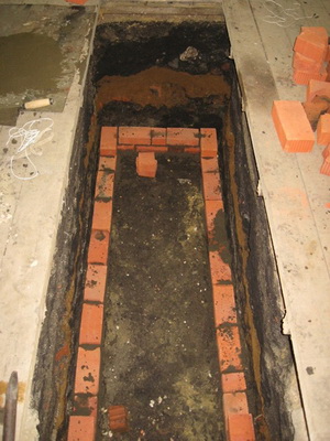 По периметру осмотровой ямы стяжку делают только до половины ширины стены, чтобы потом в образовавшееся углубление можно было уложить щит и закрыть яму. Кроме того, по краям осмотровой ямы желательно сделать бордюр высотой около 5 см для предотвращения затекания воды и других жидкостей. Можно продолжить кладку в полкирпича, залить бетоном или установить металлическую раму из уголка.